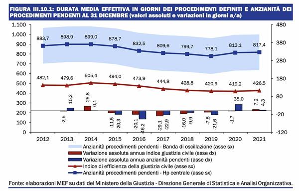 I dati definitivi del 2021 mostrano un aumento marginale della durata media effettiva in giorni (1,7 per cento a/a), sebbene in valore assoluto l’indicatore risulti sostanzialmente in linea con i livelli osservati prima dell’insorgere della pandemia. L’anzianità dei procedimenti pendenti, per il 2021, è stimata in lieve crescita (4,3 giorni a/a); tale variazione cumulata con quella del 2020 (+35 giorni a/a) ha annullato i miglioramenti conseguiti nel triennio 2017-2019 e potrebbe condizionare negativamente il dato della durata media effettiva nei prossimi anni.