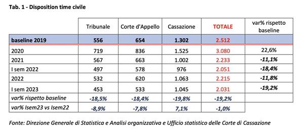 Per quanto riguarda la giustizia civile, i dati del I semestre 2023 segnalano valori più bassi rispetto alla baseline 2019 per tutti gli indicatori PNRR come visibile dalle Tab. 1 e 2, in specie: