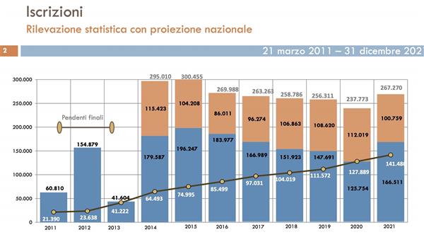 Il confronto delle iscrizioni e delle definizioni del 2021 con quelle del 2020 evidenzia, rispettivamente, un incremento di circa il 32% e il 40%. L’incremento è in parte imputabile a una ripresa dell’attività giudiziaria post pandemia che ha determinato un recupero, seppur parziale, delle iscrizioni e delle definizioni non effettuate nel corso del 2020.Il numero delle iscrizioni nella materia assicurativa diminuisce di circa il 4% se confrontata con le iscrizioni dell’anno 2019. Ciò è imputabile prevalentemente ad una riduzione delle iscrizioni presso gli organismi “outlier” (organismi che trattano prevalentemente procedimenti in materia assicurativa che si concludono con la mancata comparizione dell’aderente nel 99% dei casi) che tuttavia restano molto numerose (100.759). Confrontando i dati del 2021 con quelli del 2019, un incremento (+23%), attribuibile alla sentenza n. 19596/2020 del 18.09.2020 della Corte di Cassazione: