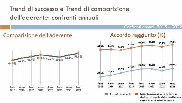 Nell'anno 2022 la percentuale di comparizione della parte convocata in mediazione è pari al 51,8% e nel 28,9% dei casi viene raggiunto l’accordo. La materia in cui maggiormente le parti aderiscono è patti di famiglia, seguita da successioni e divisioni ereditarie, diritti reali. Sono in aumento le adesioni per i contratti bancari. Nel 2022 si assiste ad un tendenziale incremento di accordo raggiunto.