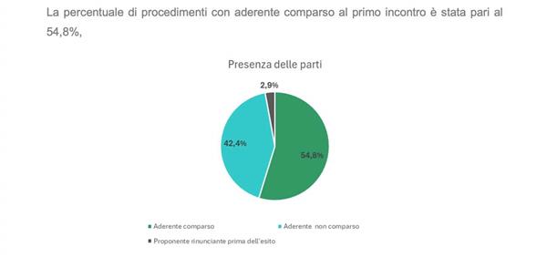 La percentuale di accordi raggiunti quando l’aderente compare è stata del 30,6%, leggermente inferiore rispetto al 2024 (32,8%). Se le parti decidono di proseguire la mediazione dopo il primo incontro, la percentuale di accordi raggiunti sale al 53,1%. Gli organismi delle Camere di commercio hanno registrato il tasso più alto di accordi raggiunti (57,6%), seguiti dagli organismi privati (55,5%).
