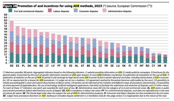 (*) Massimo possibile: 68 punti. Indicatori aggregati basati sui seguenti indicatori: 1) sito web che fornisce informazioni sull'ADR; 2) campagne pubblicitarie sui media; 3) opuscoli per il pubblico in generale; 4) fornitura da parte del tribunale di sessioni informative specifiche sull'ADR su richiesta; 5) coordinatore del tribunale per l'ADR/la mediazione; 6) pubblicazione di valutazioni sull'uso dell'ADR; 7) pubblicazione di statistiche sull'uso dell'ADR; 8) copertura parziale o totale da parte del patrocinio legale dei costi sostenuti per l'ADR; 9) rimborso totale o parziale delle spese processuali, comprese le imposte di bollo, in caso di esito positivo dell'ADR; 10) non è richiesto un avvocato per le procedure ADR; 11) il giudice può fungere da mediatore; 12) l'accordo raggiunto dalle parti diventa esecutivo per il tribunale; 13) possibilità di avviare un procedimento/ presentare una domanda e prove documentali online; 14) le parti possono essere informate dell'avvio e delle varie fasi delle procedure per via elettronica; 15) possibilità di pagare online le indennità applicabili; 16) uso della tecnologia (applicazioni di intelligenza artificiale, chat bot) per facilitare la presentazione e la risoluzione delle controversie; 17) altri mezzi. Per ciascuno di questi 17 indicatori è stato assegnato un punto per ogni settore del diritto.