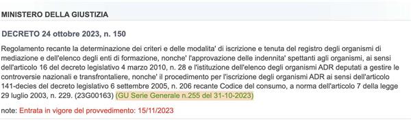 È stato pubblicato in Gazzetta Ufficiale (GU Serie Generale n.255 del 31-10-2023) il decreto del Ministro della Giustizia 24 ottobre 2023, n. 150 la cui entrata in vigore è prevista il 15 novembre 2023 vale a dire il Regolamento recante la determinazione dei criteri e delle modalità di iscrizione e tenuta del Registro degli Organismi di mediazione e dell'Elenco degli enti di formazione, nonché l'approvazione delle indennità spettanti agli Organismi, ai sensi dell'articolo 16 del decreto legislativo 4 marzo 2010, n. 28 e l'istituzione dell'Elenco degli Organismi ADR deputati a gestire le controversie nazionali e transfrontaliere, nonché il procedimento per l'iscrizione degli Organismi ADR ai sensi dell'articolo 141-decies del decreto legislativo 6 settembre 2005, n. 206 recante Codice del consumo, a norma dell'articolo 7 della legge 29 luglio 2003, n. 229.